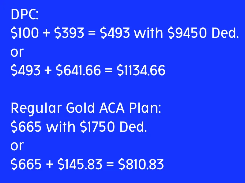 Most DPC services run between $50 and $150 per month for a membership. We’ll split the difference at $100 for the sake of easy calculations. We said you need a catastrophic policy to go with that primary care. According to Forbes on 9/23/2025 the average catastrophic policy costs $393 per month. We averaged the ten year tranches of data (21-60) omitting the 27 year old as skewing the numbers toward the young. The deductible is apparently limited by law to $9450.00 for the individual. According to Forbes on 3/10/2025 the average total coverage premium with a gold plan from healthcare.gov, eschewing the same 27 year old as irrelevant is $665 per month. Sounds like the DPC is a far better deal, almost a third lower, right? The average deductible for that gold plan that covers everything is about $1750.00. If something does happen, your catastrophic policy will actually keep you from going to the hospital because you can’t afford that $9450 deductible. Further, that deductible renews every year. If you want to make the catastrophic insurance equivalent, you need to have the difference in reserve in cash. Every year. $9450 - $1750 = $7700. To make these two equivalent you need to save an additional $641.66 per month ($7700 / 12) to account for the increased deductible.