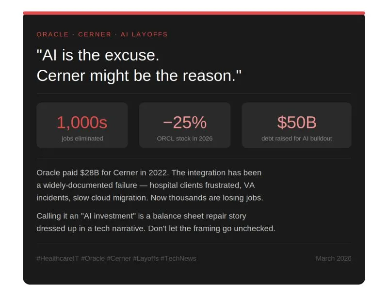 On March 31, 2026, Kris Gates published a post on LinkedIn detailing her perception of what is wrong with Oracle and what she believed the natural outcome to be. Forbes published the latest in a series, this morning, “Oracle’s Massive 30,000 Layoff As AI Spending Surges” detailing massive debt routed to building out AI infrastructure requiring approximately $50 billion in capital spending for fiscal year 2026 alone, $15 billion more than initially communicated to Wall Street. In January, the company announced plans to raise $50 billion in debt and equity to fund the expansion. Its stock has been under pressure from investors concerned about the debt load and dwindling free cash flow.